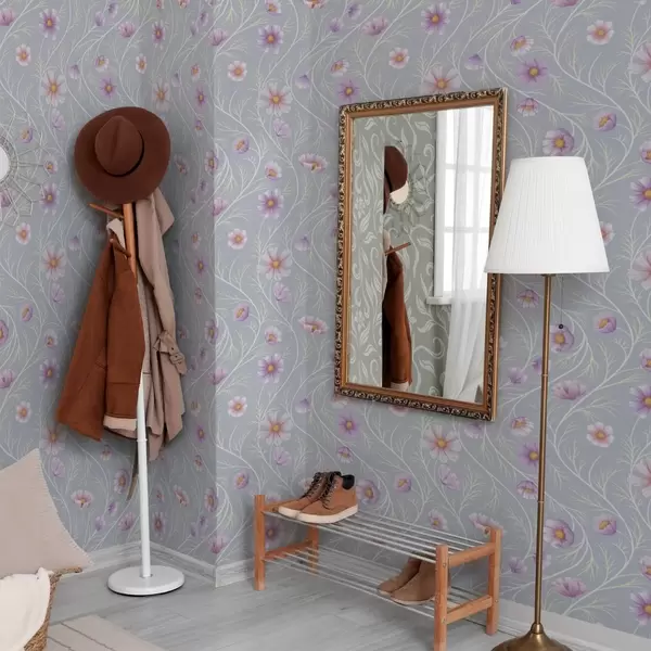 Tapéta Rózsaszínű kozmosz és karcsú szárak szürke háttér előtt Nr. a00791