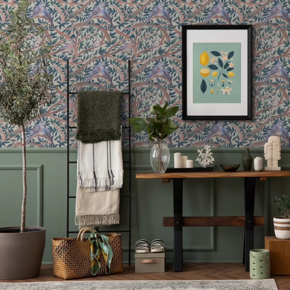 Tapéta Galambok ágak és levelek között, lágy pasztell színekkel Nr. a00796