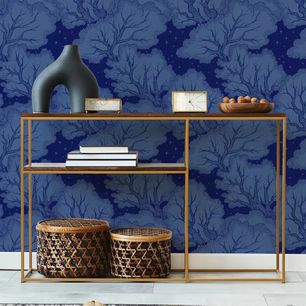 Tapéta Fák sziluettjei csillagos ég alatt, kék árnyalatokban Nr. a00798