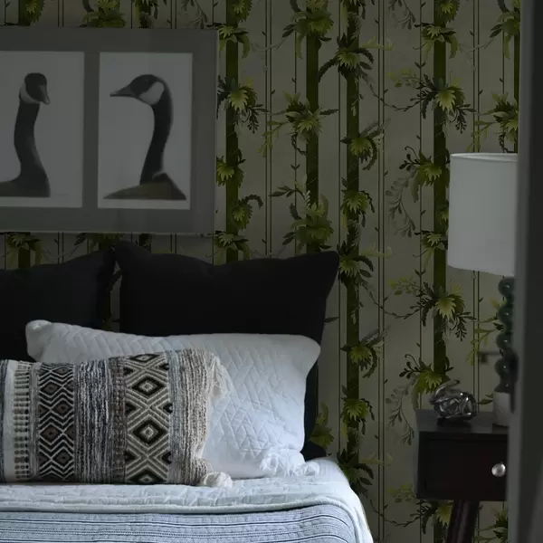 Tapéta Zöld levelek függőleges csíkokban szürke háttér előtt Nr. a00807v1