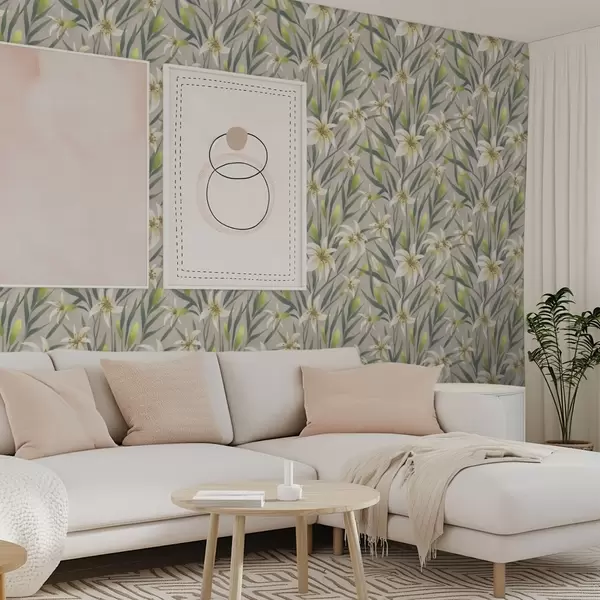 Tapéta Krém színű liliomok levelekkel szürke-bézs háttérrel Nr. a00837
