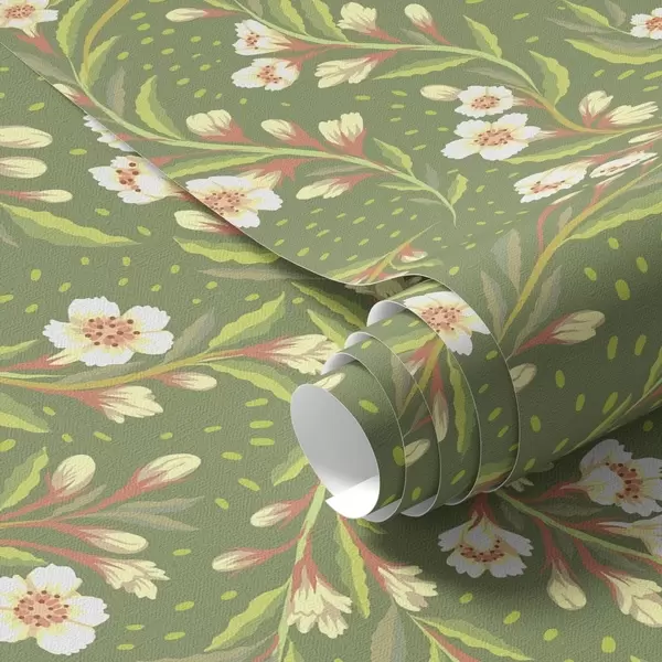 Tapéta Olajzöld háttér előtt terjedelmes ágak krémes virágokkal Nr. a00850