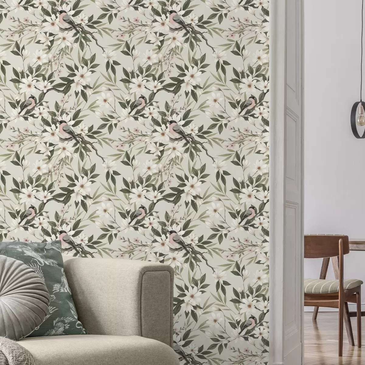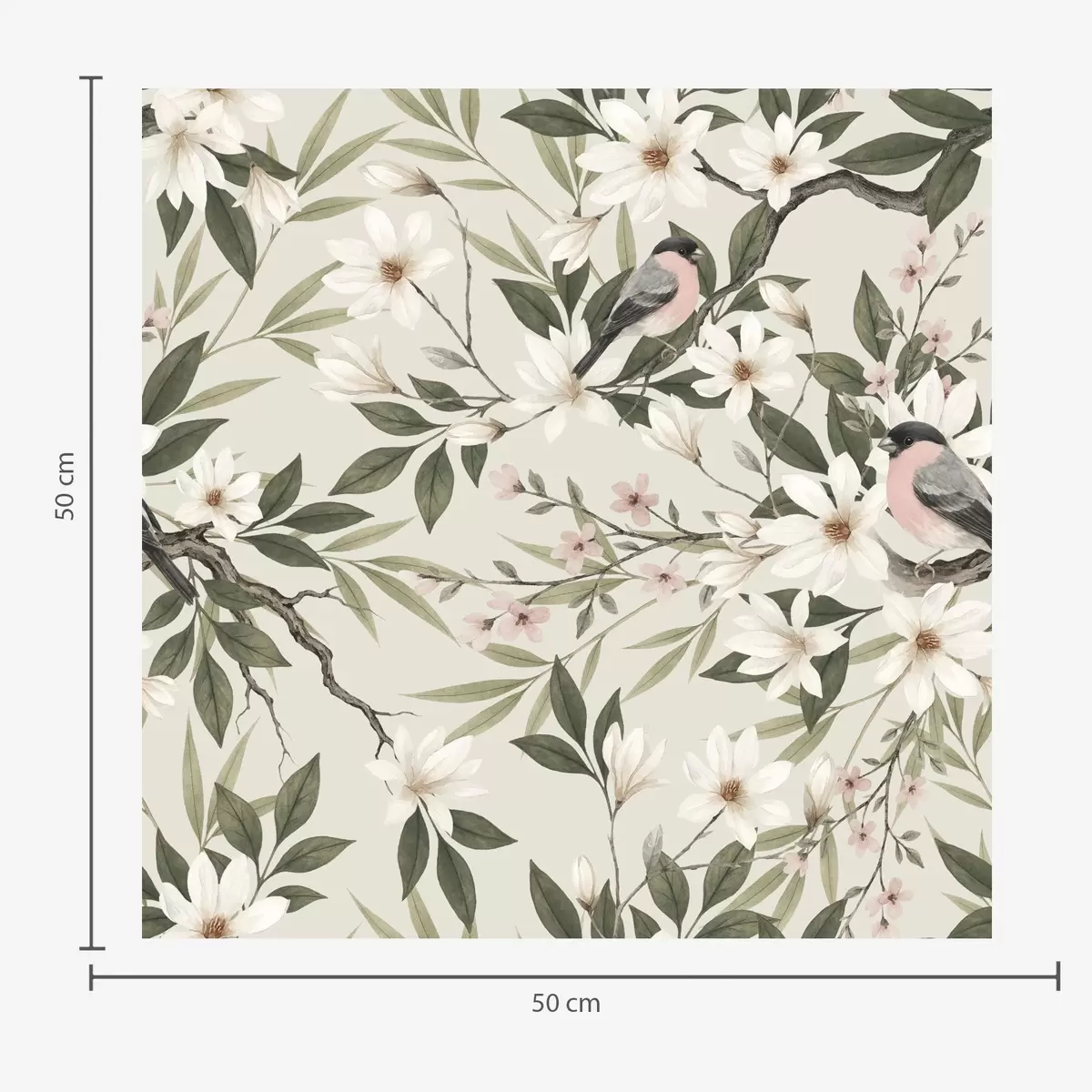 Tapéta Fehér mellű bullfinchok krémes virágokkal borított ágakon Nr. a00889