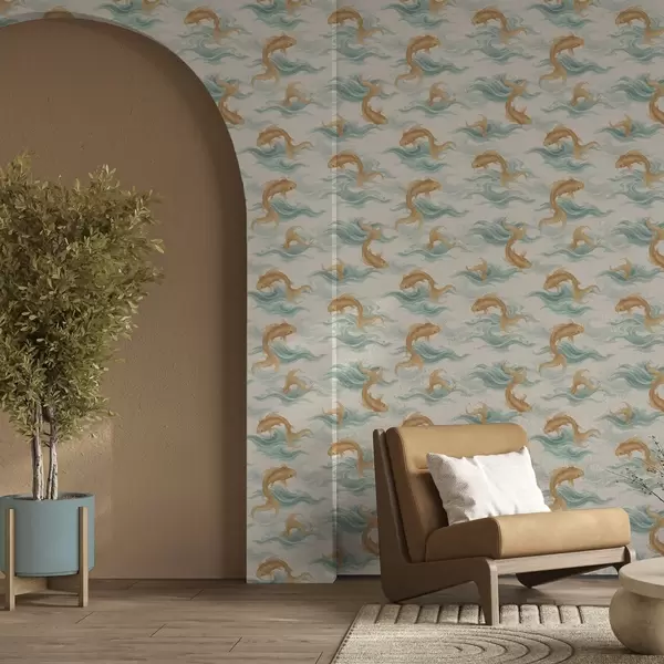Tapéta Borostyánszínű koi halak úsznak a lágy türkizkék hullámok között Nr. a00894