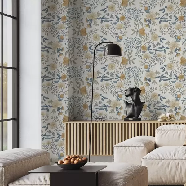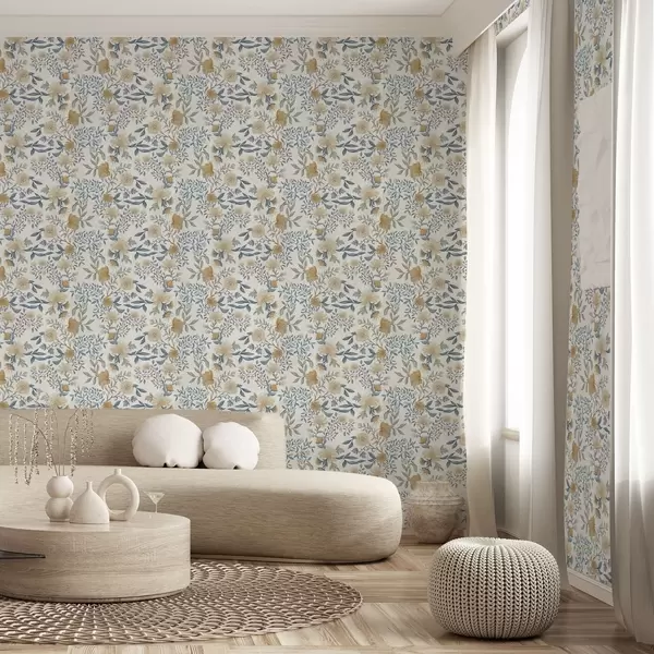 Tapéta Sárga virágok és kék zöld növényzet tejfehér háttér előtt Nr. a00934v2