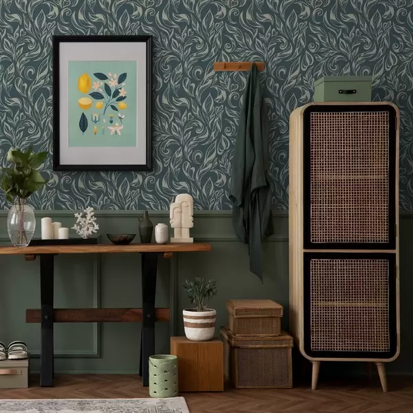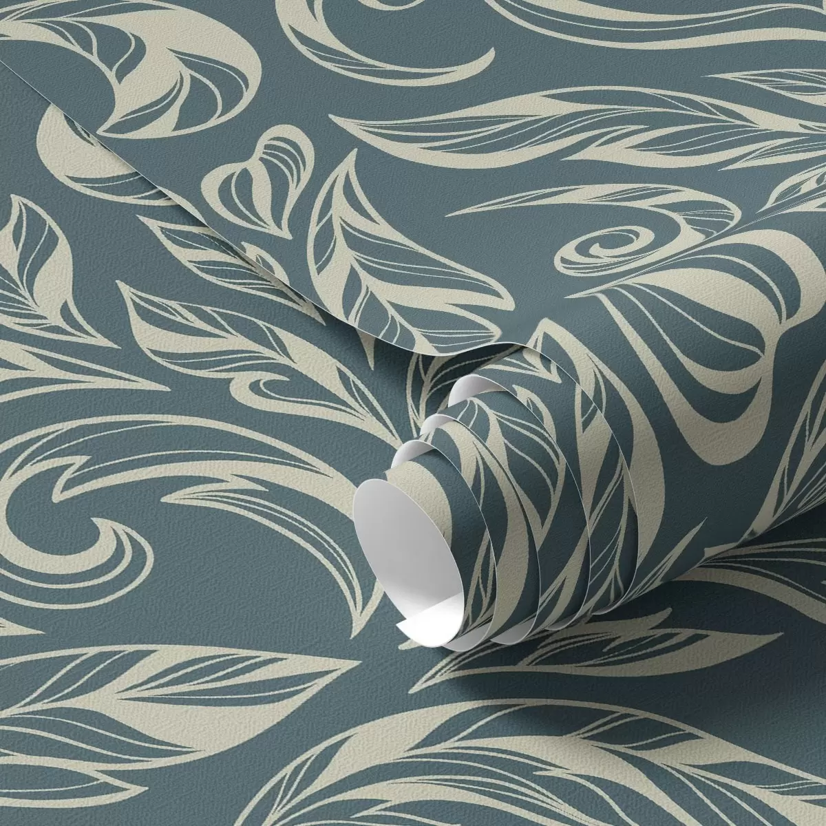 Tapéta Kékesszürke háttérrel, leveles mintázatú, vékony vonalakkal Nr. a00940