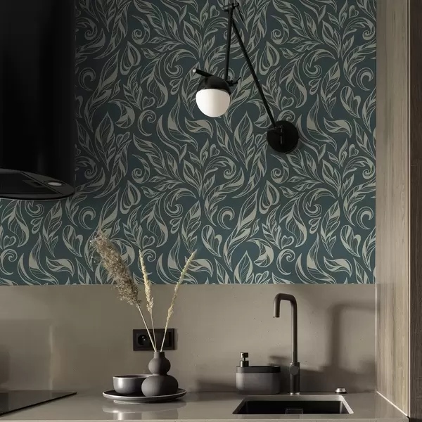 Tapéta Kékesszürke háttérrel, leveles mintázatú, vékony vonalakkal Nr. a00940
