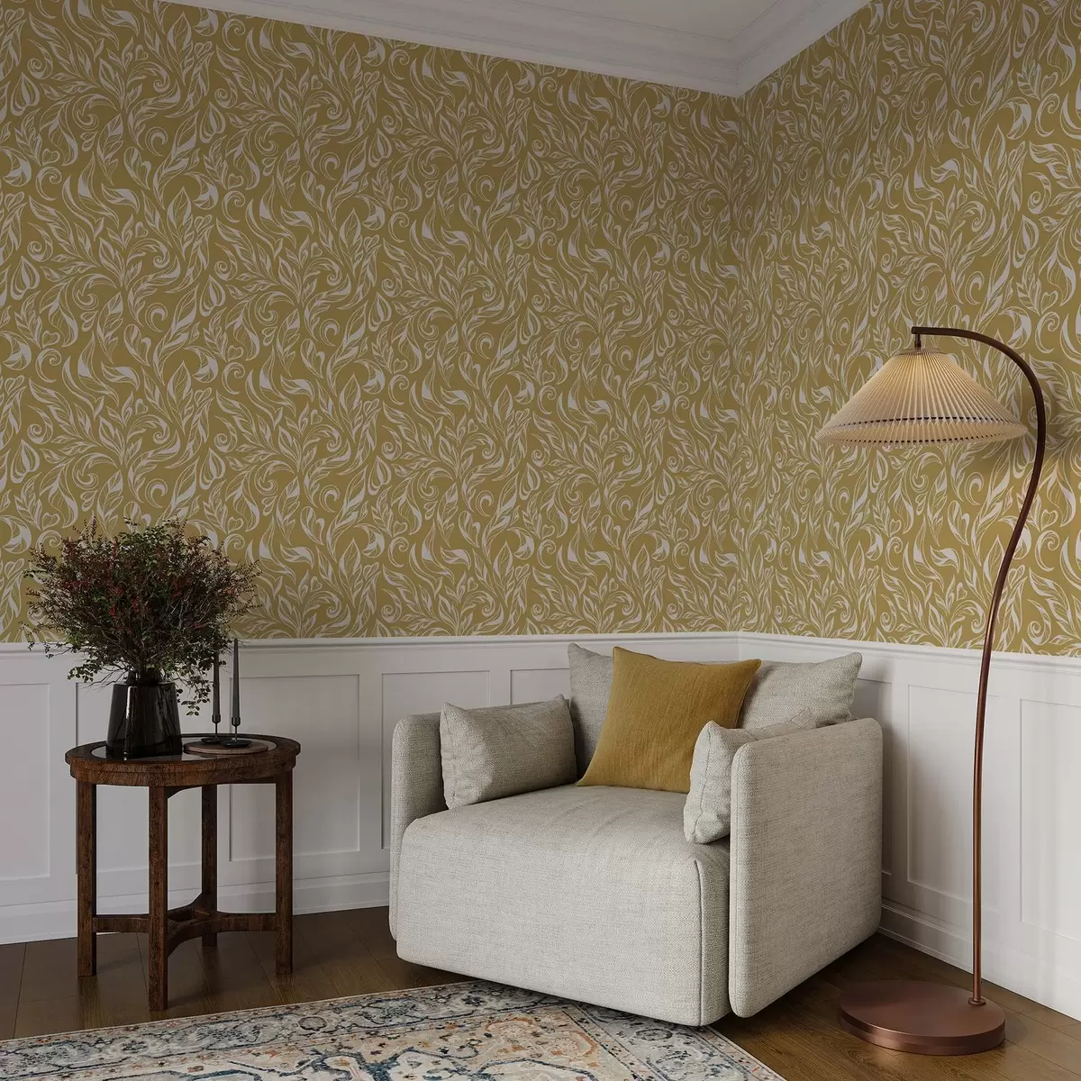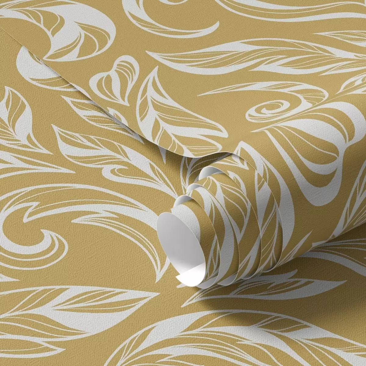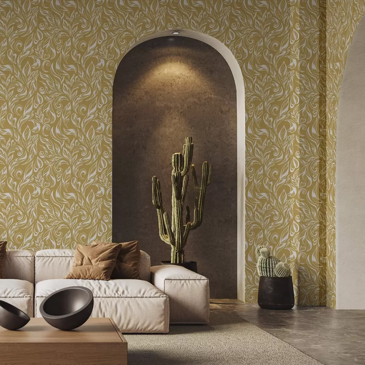 Tapéta Krémfehér leveles díszítés meleg okker háttérrel Nr. a00940v1