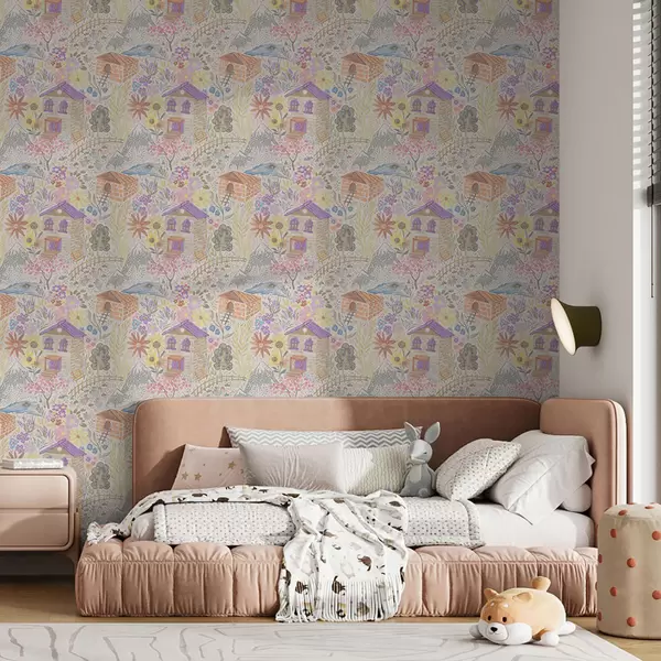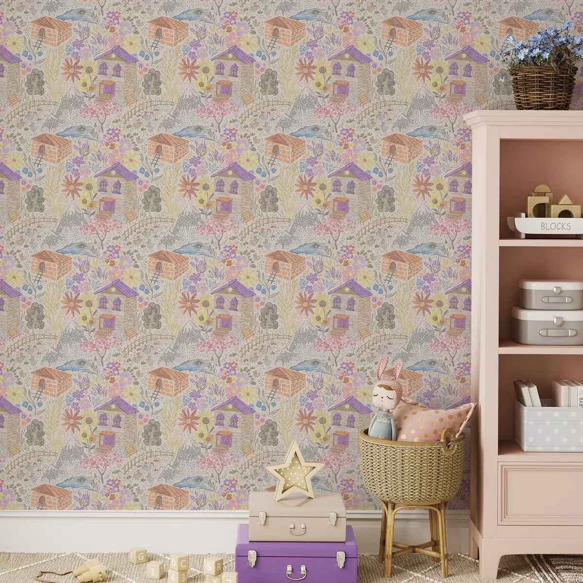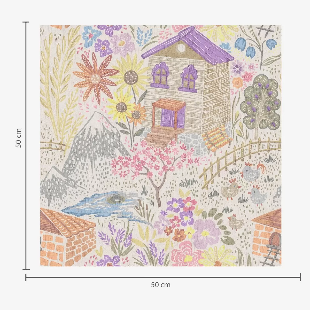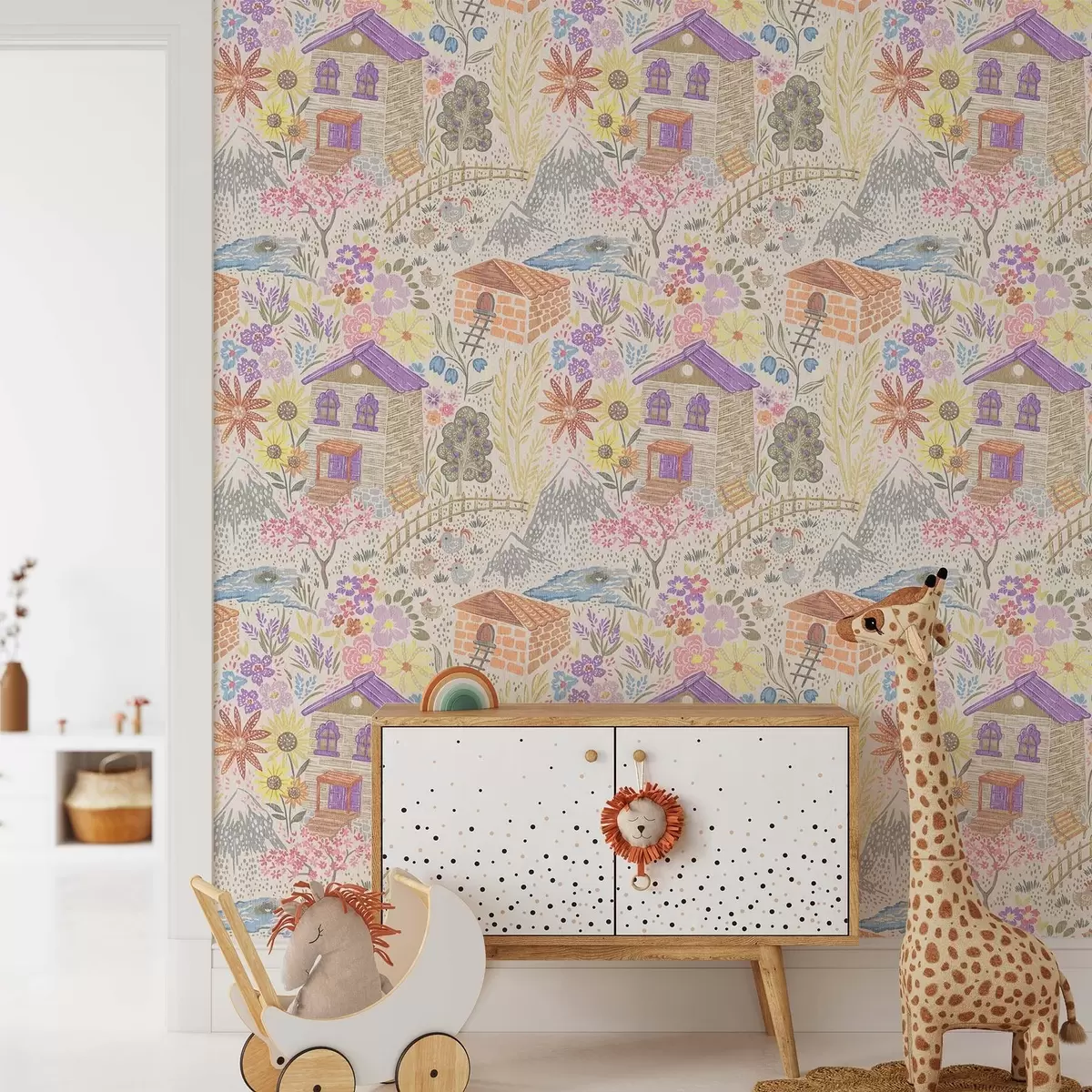 Tapéta Gyermeki falurajz házzal, hegyekkel és virágokkal Nr. a00952