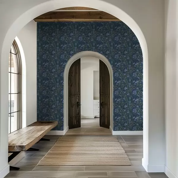 Tapéta Éjfélkék bogyók és fehér virágok sűrű lombozatban Nr. a00994