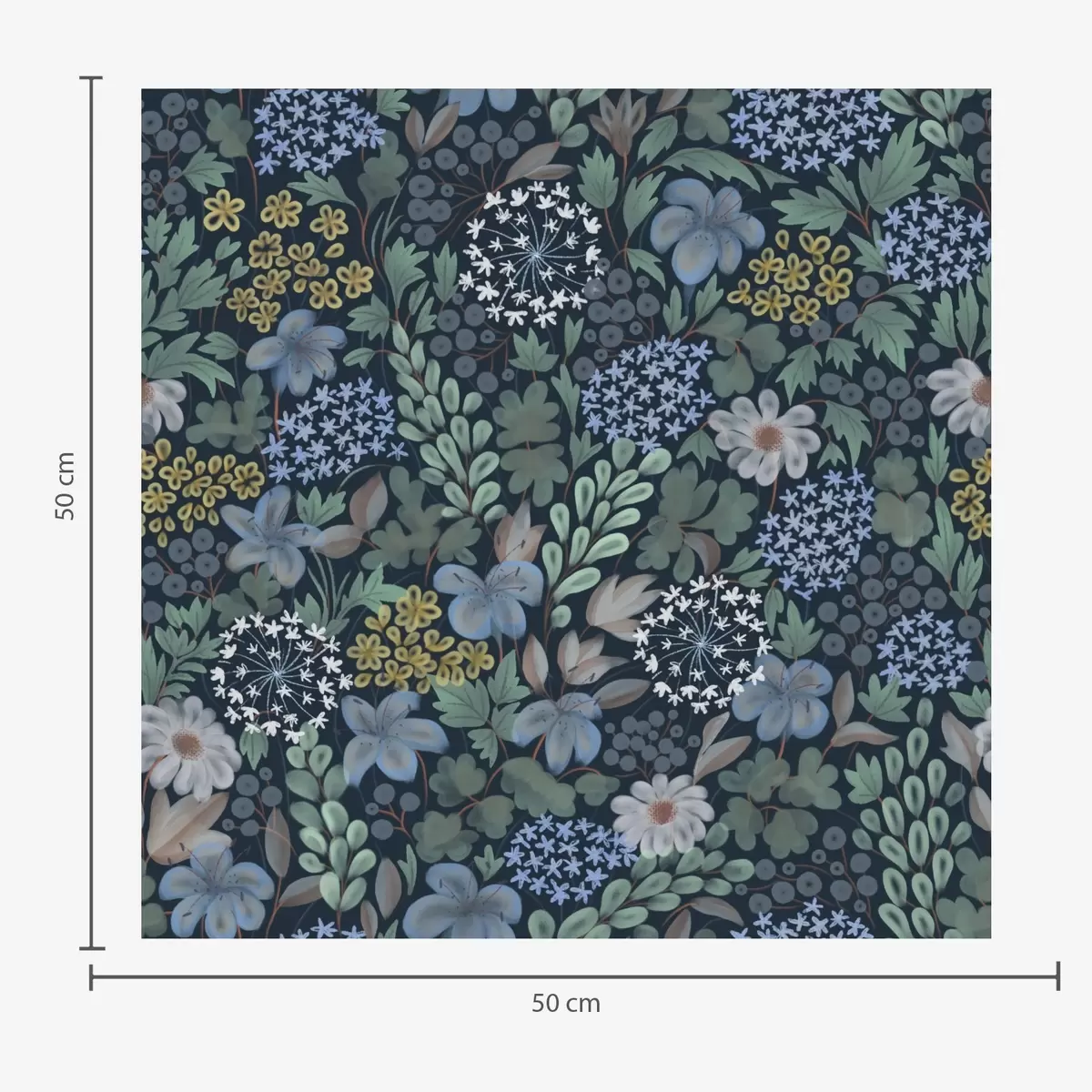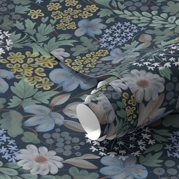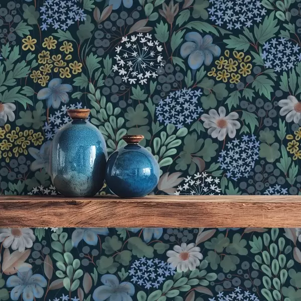 Tapéta Éjszakai kert kék liliomokkal, bogyós gyümölcsökkel és vadon termő növényzettel Nr. a00996