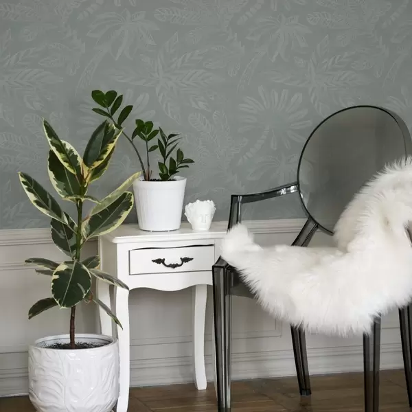 Tapéta Matt, nagy trópusi levelek menta-szürke színpalettában Nr. a01001