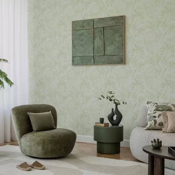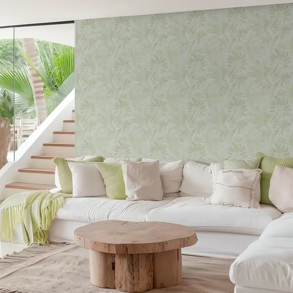 Tapéta Vázlatos trópusi levelek friss, világoszöld árnyalatokban Nr. a01001v1
