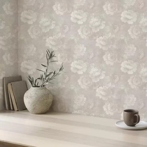 Tapéta Halvány pünkösdi rózsák lenvászon textúrán, lágy bézs színpalettán Nr. a01018
