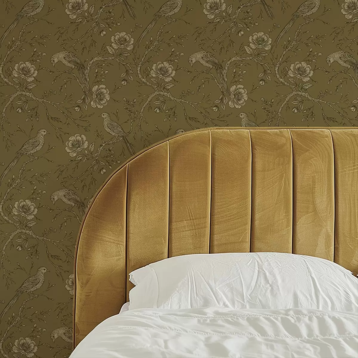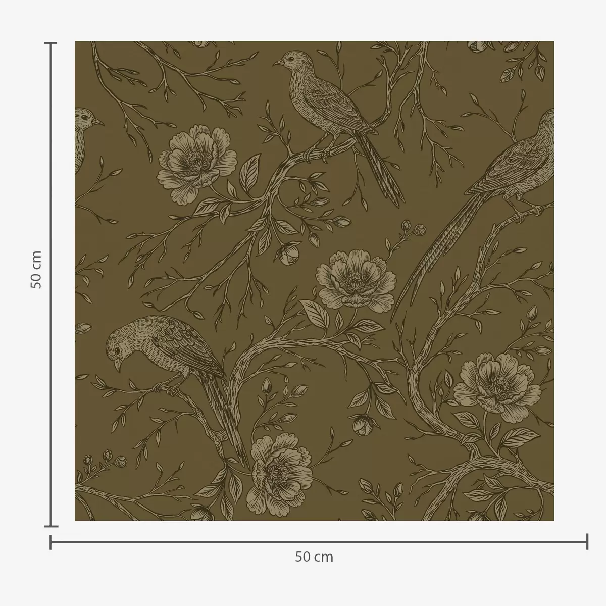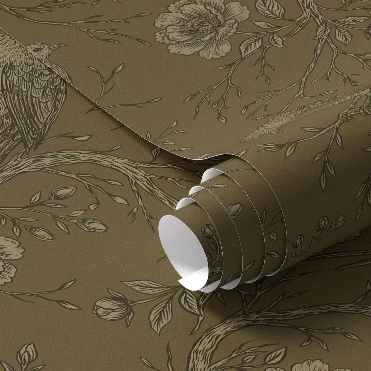 Tapéta Vintage madarak és virágok meleg olíva háttér előtt Nr. a01022v1