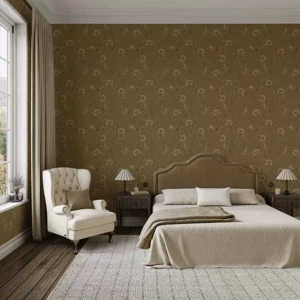 Tapéta Vintage madarak és virágok meleg olíva háttér előtt Nr. a01022v1