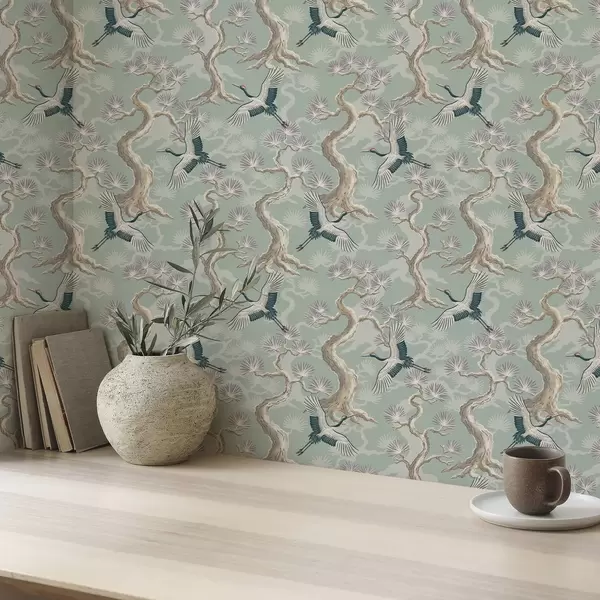 Tapéta Darvak ívelt ágak között, lágy zsályaszínű háttér előtt Nr. a01023