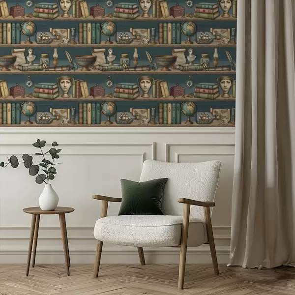 Tapéta Vintage polcok könyvekkel, földgömb és tengeri érdekességek Nr. a01036