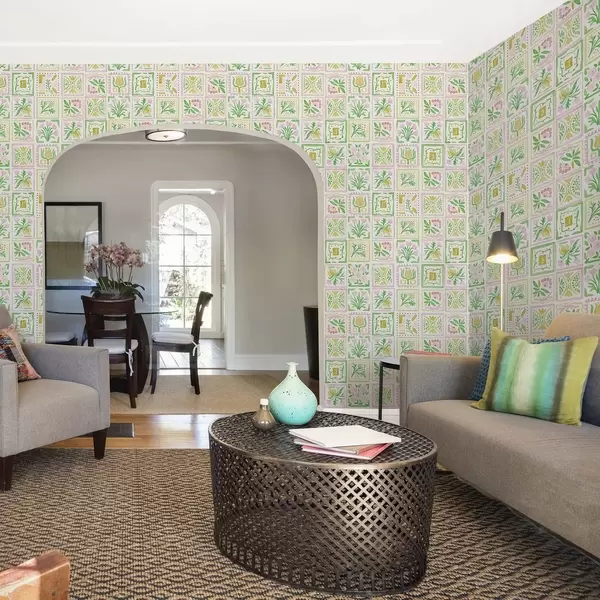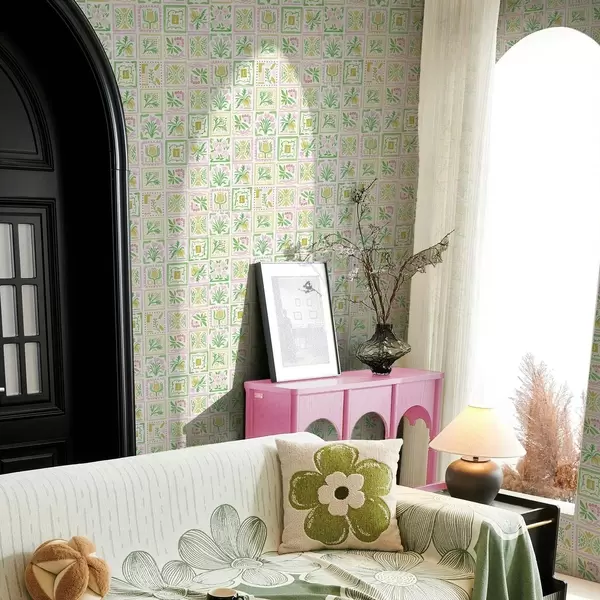 Tapéta Rózsaszín és zöld ágakkal díszített akvarell négyzetek Nr. a01082