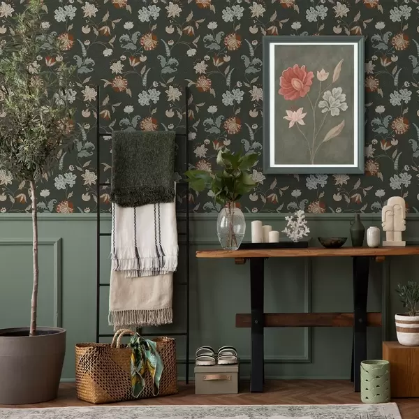 Tapéta Sötétzöld háttér dekoratív virágokkal és levelekkel Nr. a01086