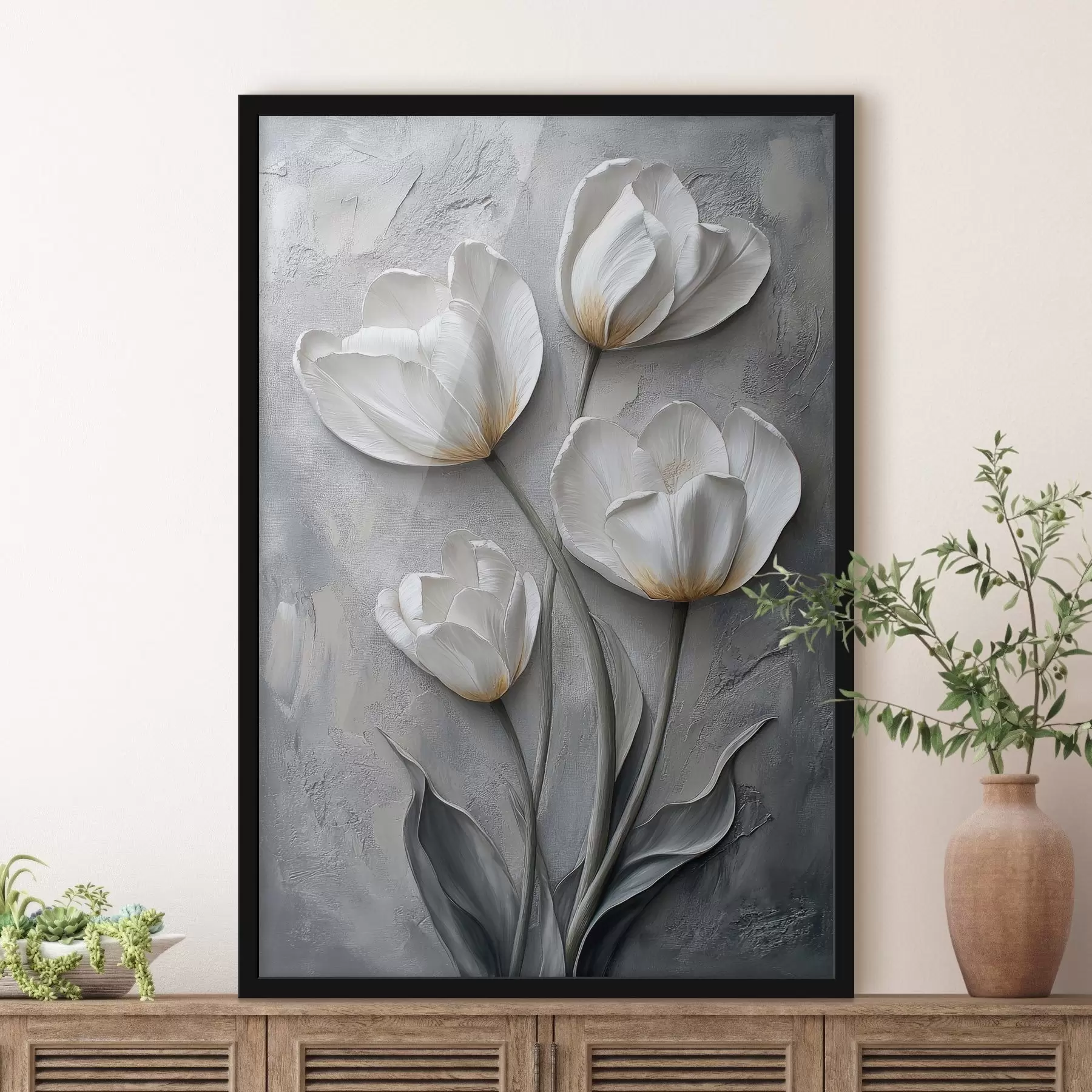Két rózsaszín flamingó áll egy fekete-fehér absztrakt háttér művészeti festmény előtt