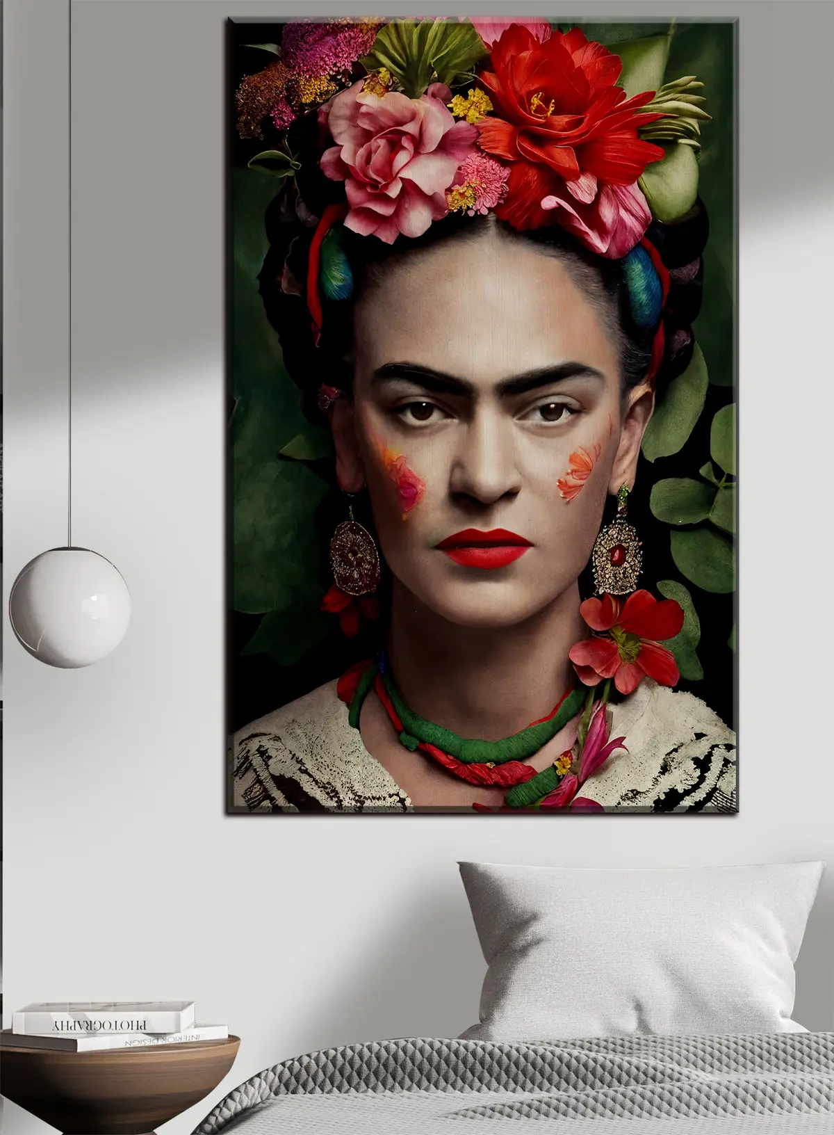Vászonkép Frida Kahlo virágokkal, zöld háttérrel Nr s32861