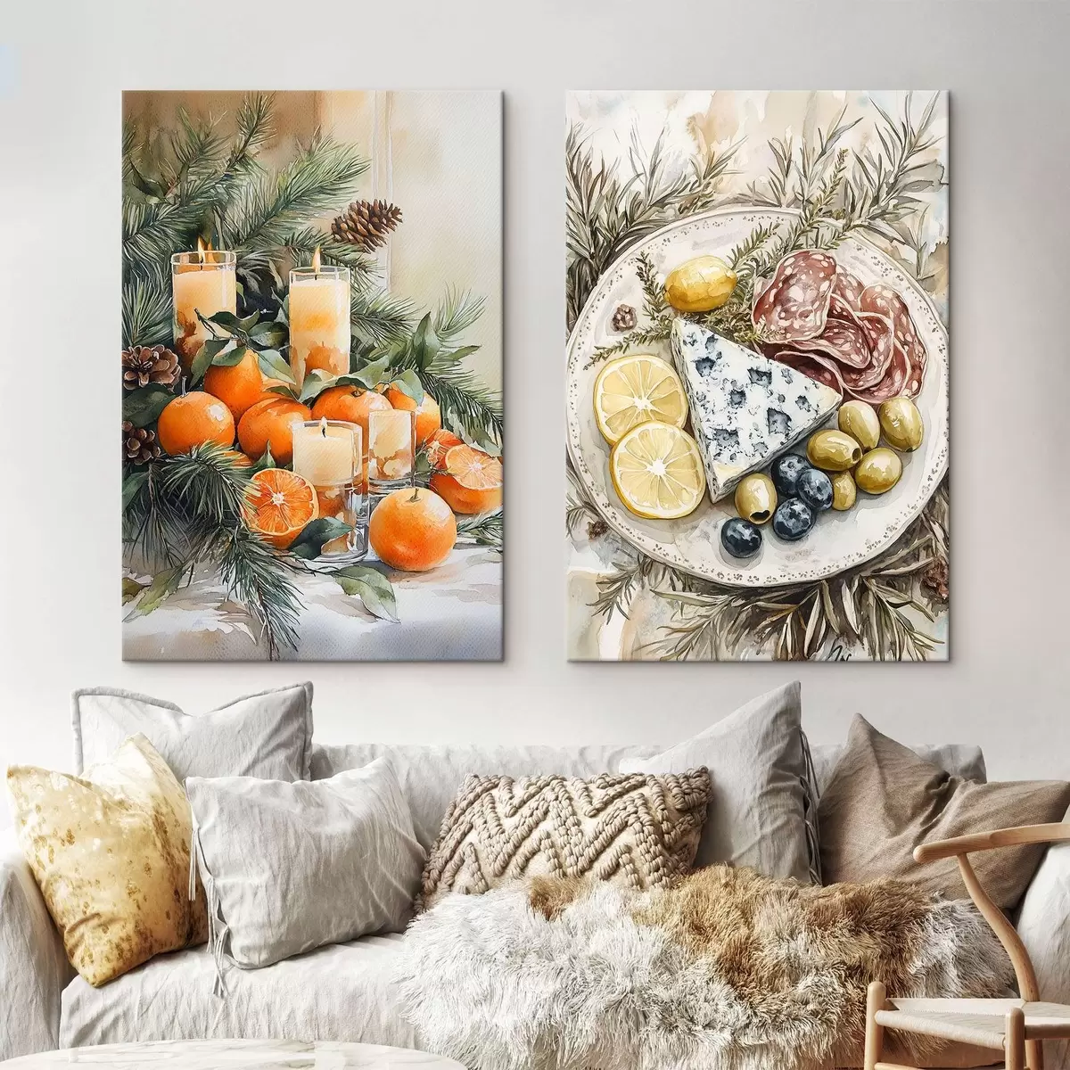 Vászonkép Ünnepi dekoráció narancsokkal, gyertyákkal és fenyőfákkal, akvarell stílusú ételek, kék sajt, szalámi, olívabogyó Nr m00389