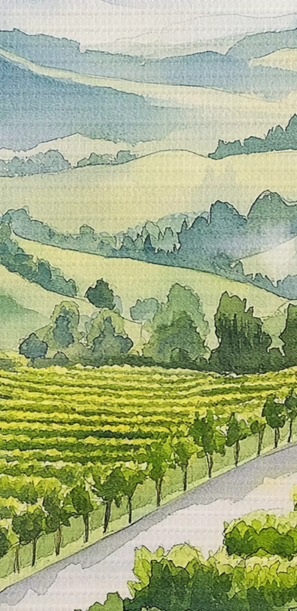 Vászonkép Gyönyörű toszkán tájak, szőlőskertek, borospoharak, akvarell stílus, Olaszország Nr m00408