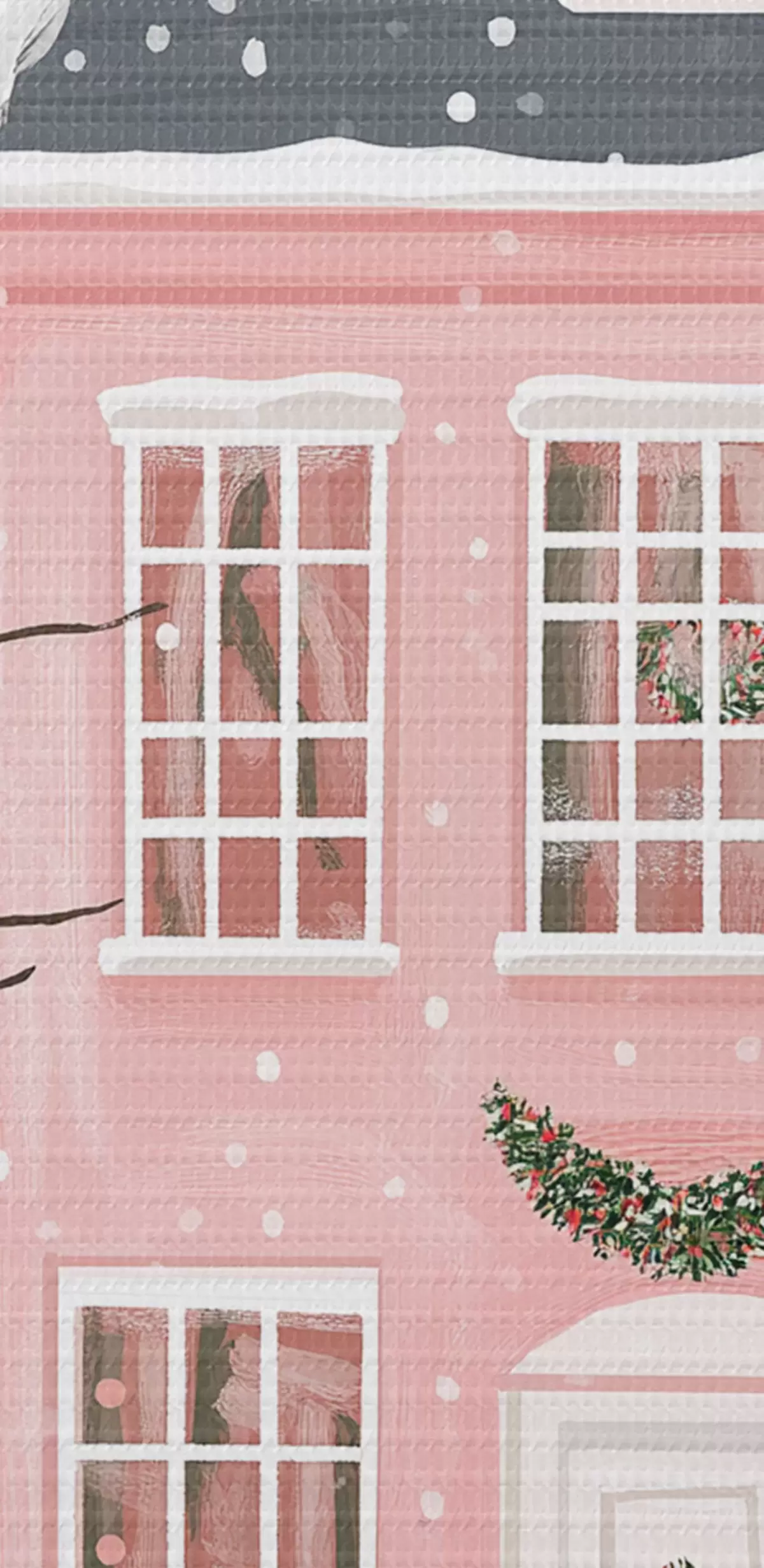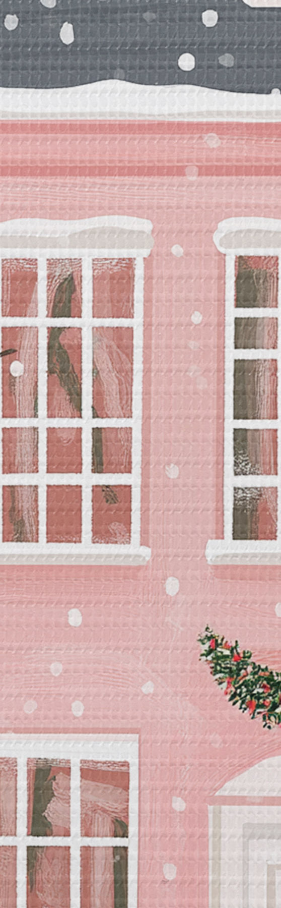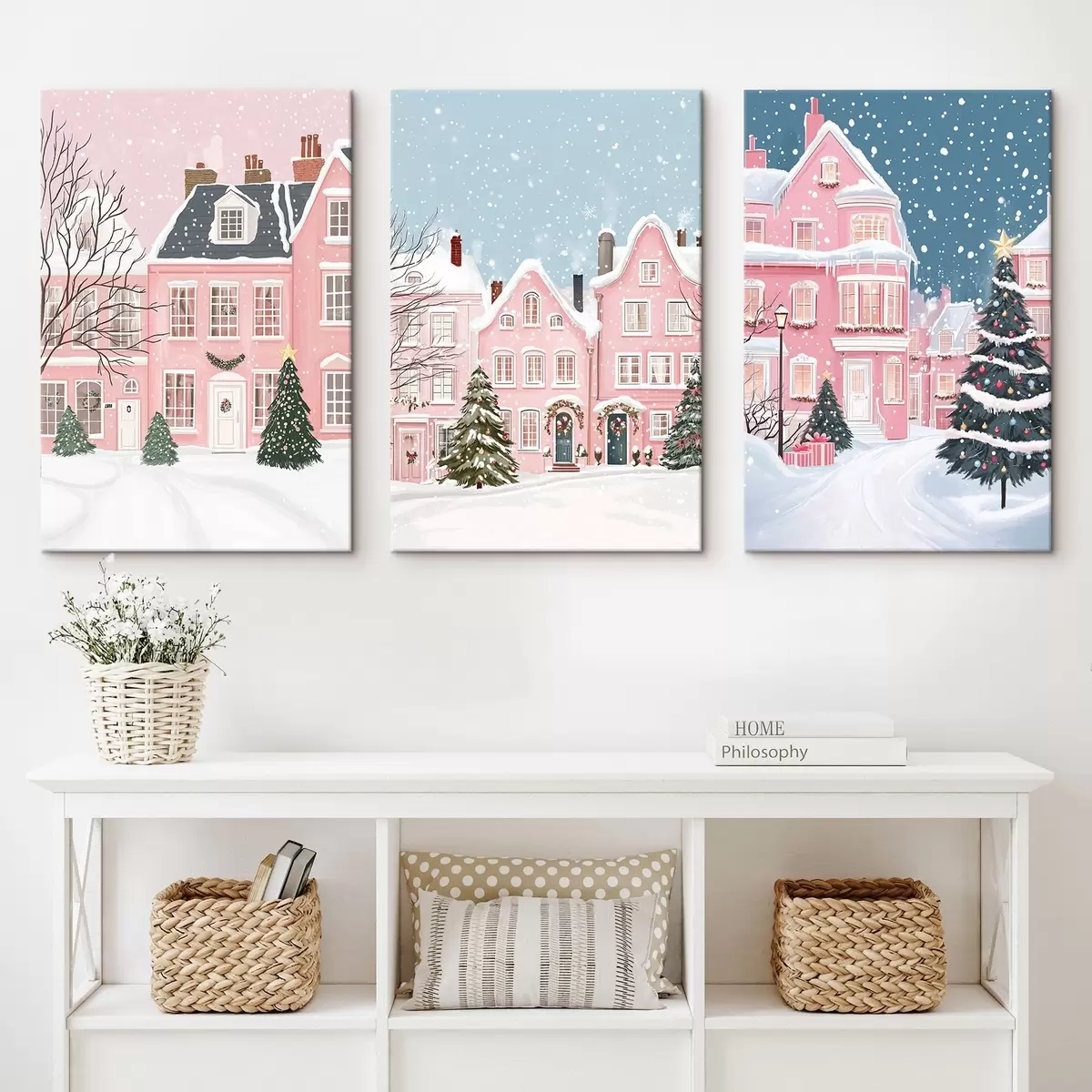 Vászonkép Gyönyörű téli város rózsaszín házakkal, fenyőfákkal, hópelyhekkel Nr m00410