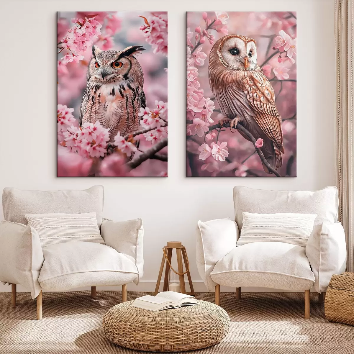 Vászonkép Baglyok a cseresznyefán, rózsaszín virágok, realizmus, természet Nr m00411