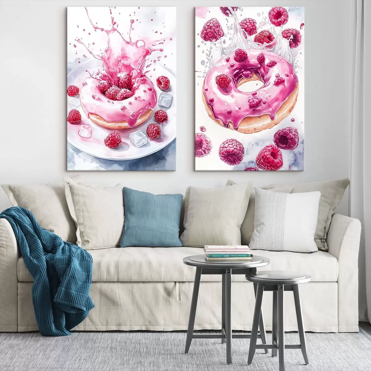 Vászonkép Finom akvarell stílusú fánkok málnával, rózsaszín színekkel Nr m00412