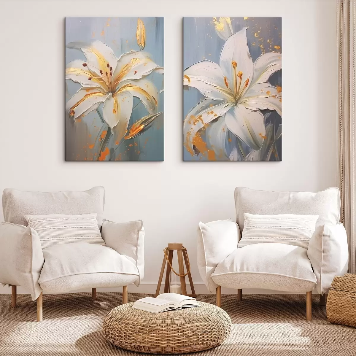 Vászonkép Fehér liliom sárga vonalakkal kék háttéren Nr m00497