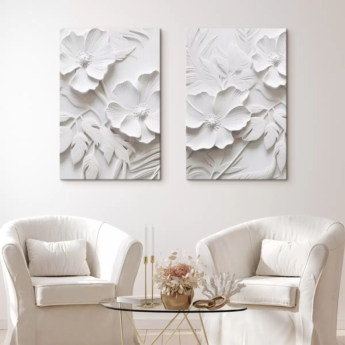Vászonkép Dekoratív minimalista fehér virágok levelekkel, dombormű utánzat, fehér háttér Nr m00524