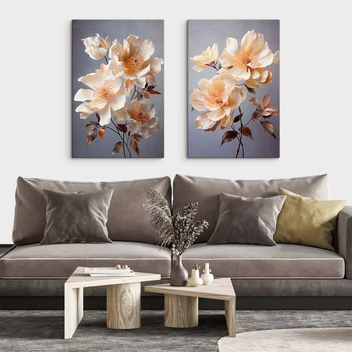 Vászonkép Texturált virágok narancssárga virágzattal és narancssárga levelekkel szürke háttéren, lágy fény, elegáns, részletes, valósághű Nr m00525