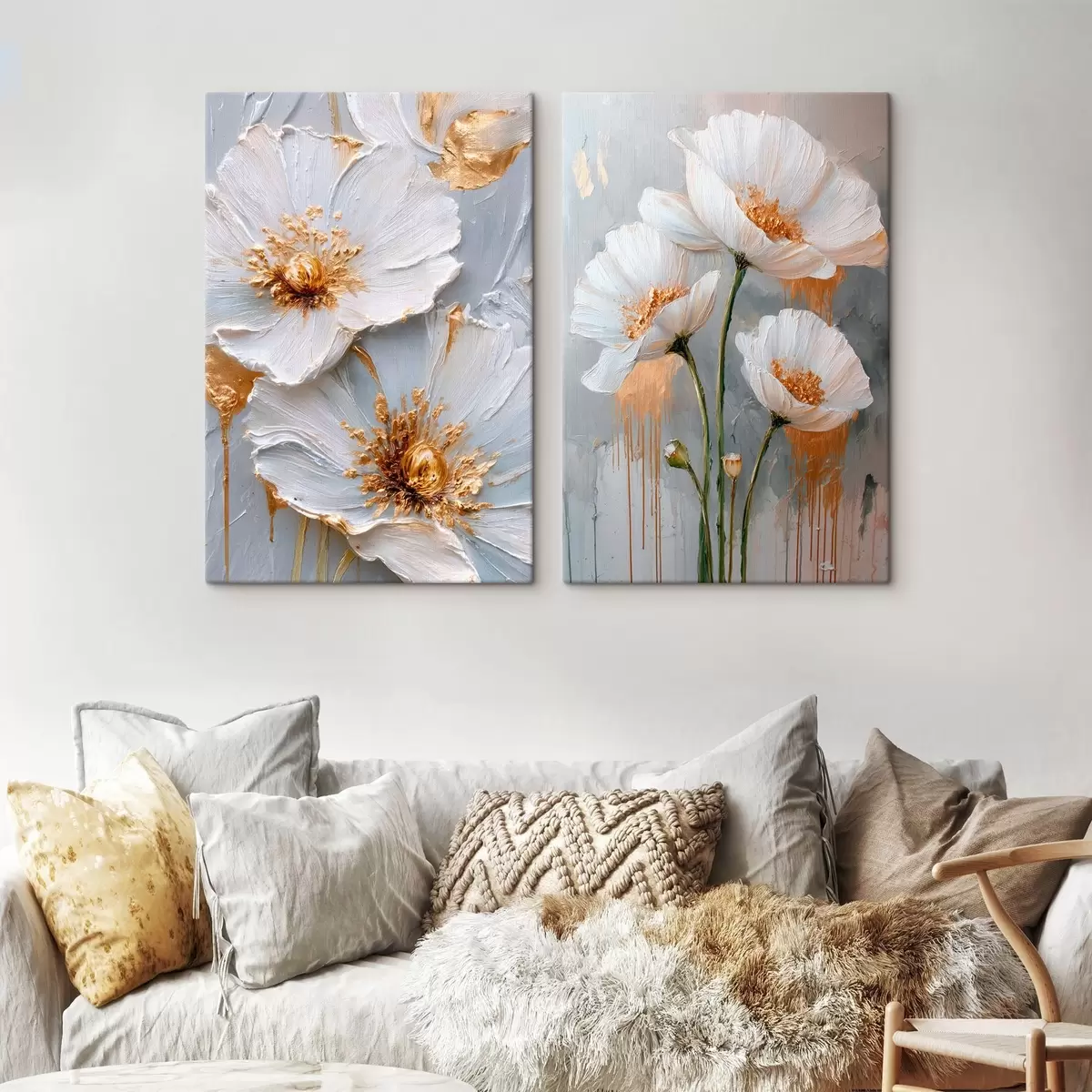 Vászonkép Volumetrikus festmény fehér virágok sárga akcentussal szürke alapon Nr m00568