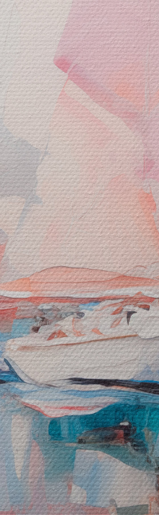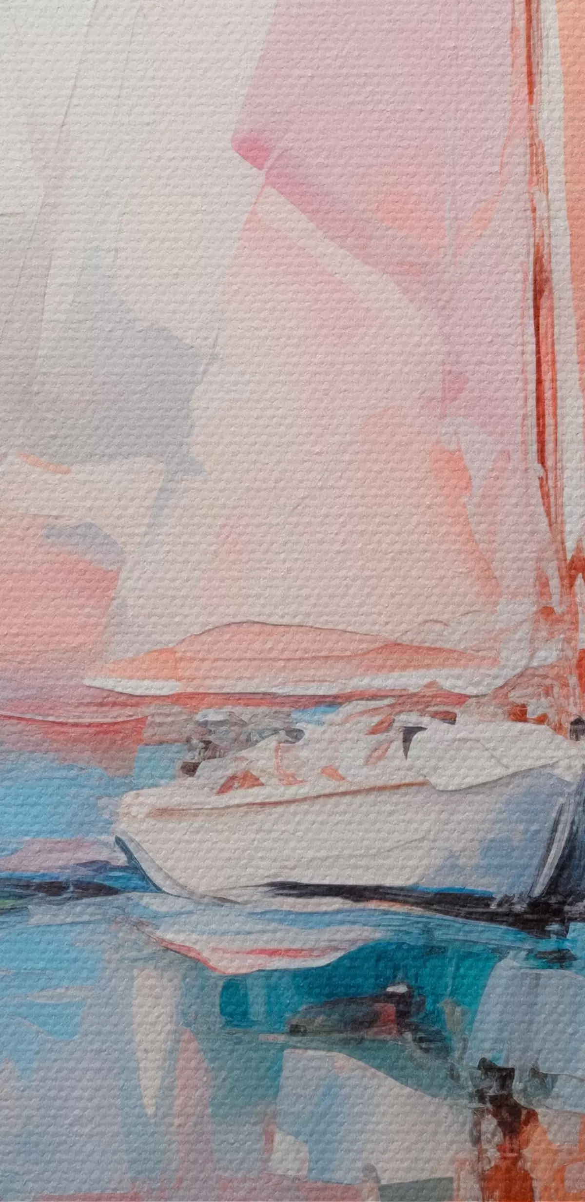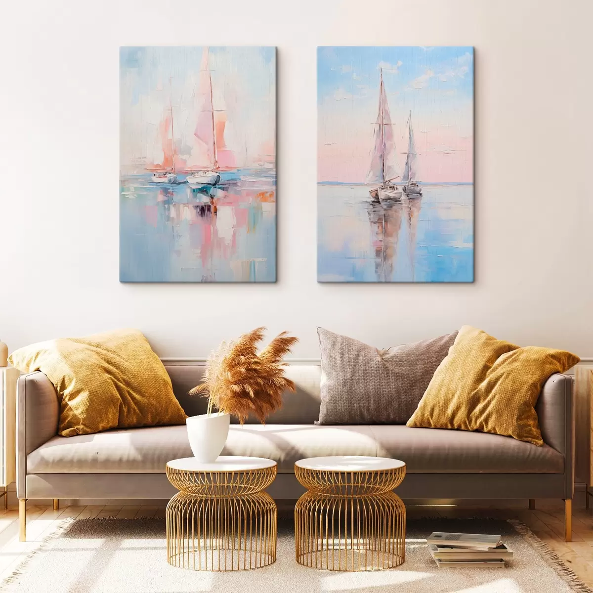 Vászonkép Vitorlások rózsaszín vitorlákkal a nyugodt tengeren, a hajók tükröződése a vízben, lágy pasztellszínekben Nr m00648