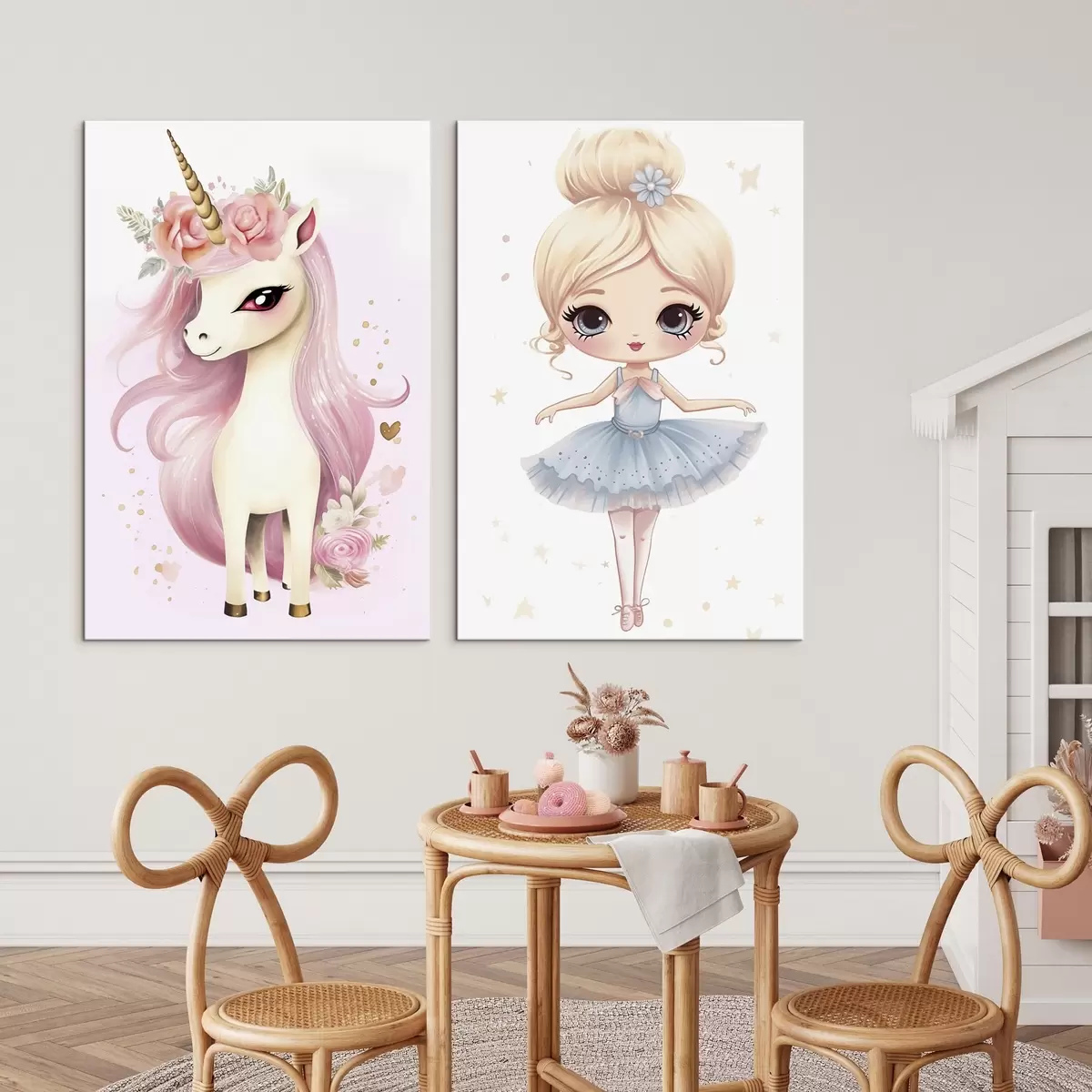 Vászonkép Balerina baba kék ruhában és rózsaszín sörényű egyszarvúval Nr m00692