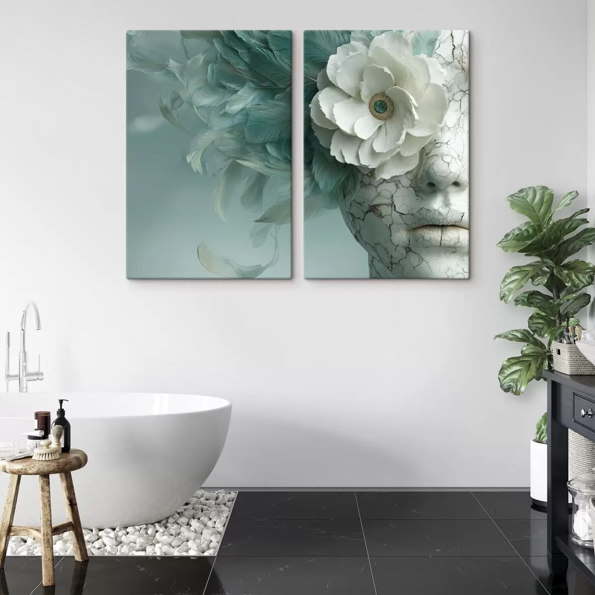 Vászonkép márványarcú lány virággal és tollakkal Nr m00699
