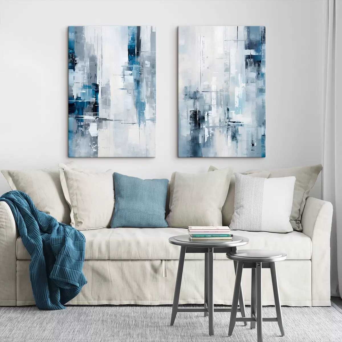 Vászonkép Absztrakt festmény utánzat kék, szürke és fehér színekkel, függőleges vonalakkal és geometriai alakzatokkal Nr m00819