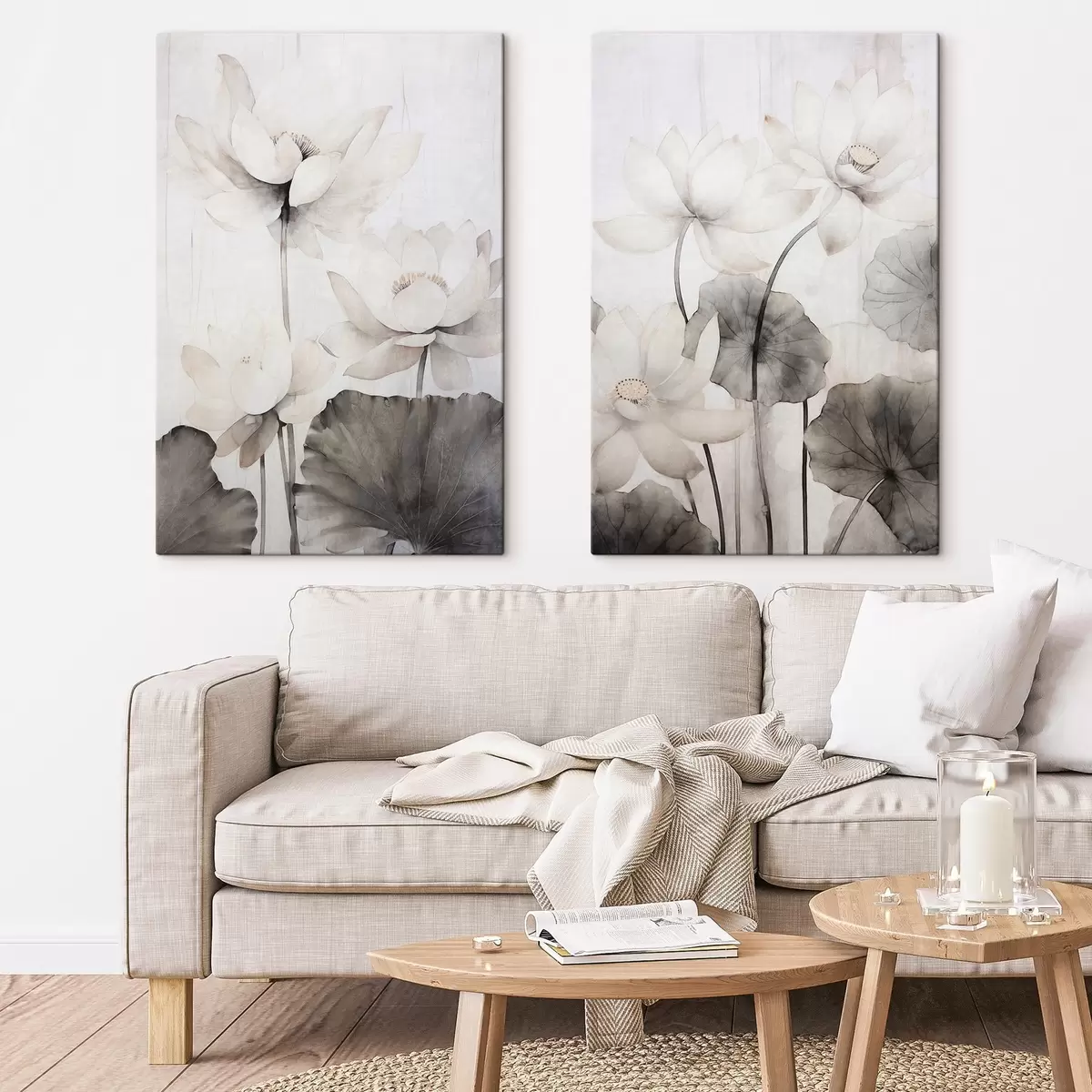Vászonkép Fehér textúrájú lótuszvirágok sötét levelekkel, világos háttérrel, minimalista dizájn Nr m00824