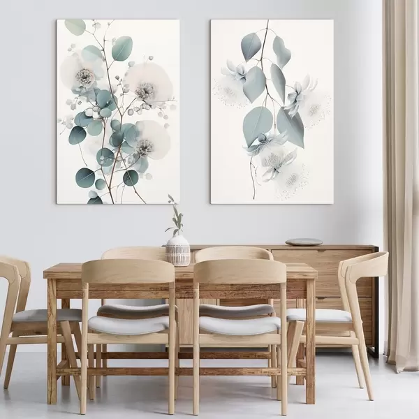 Vászonkép Eukaliptusz ág kék levelekkel és fehér virágokkal, világos háttérrel Nr m00829