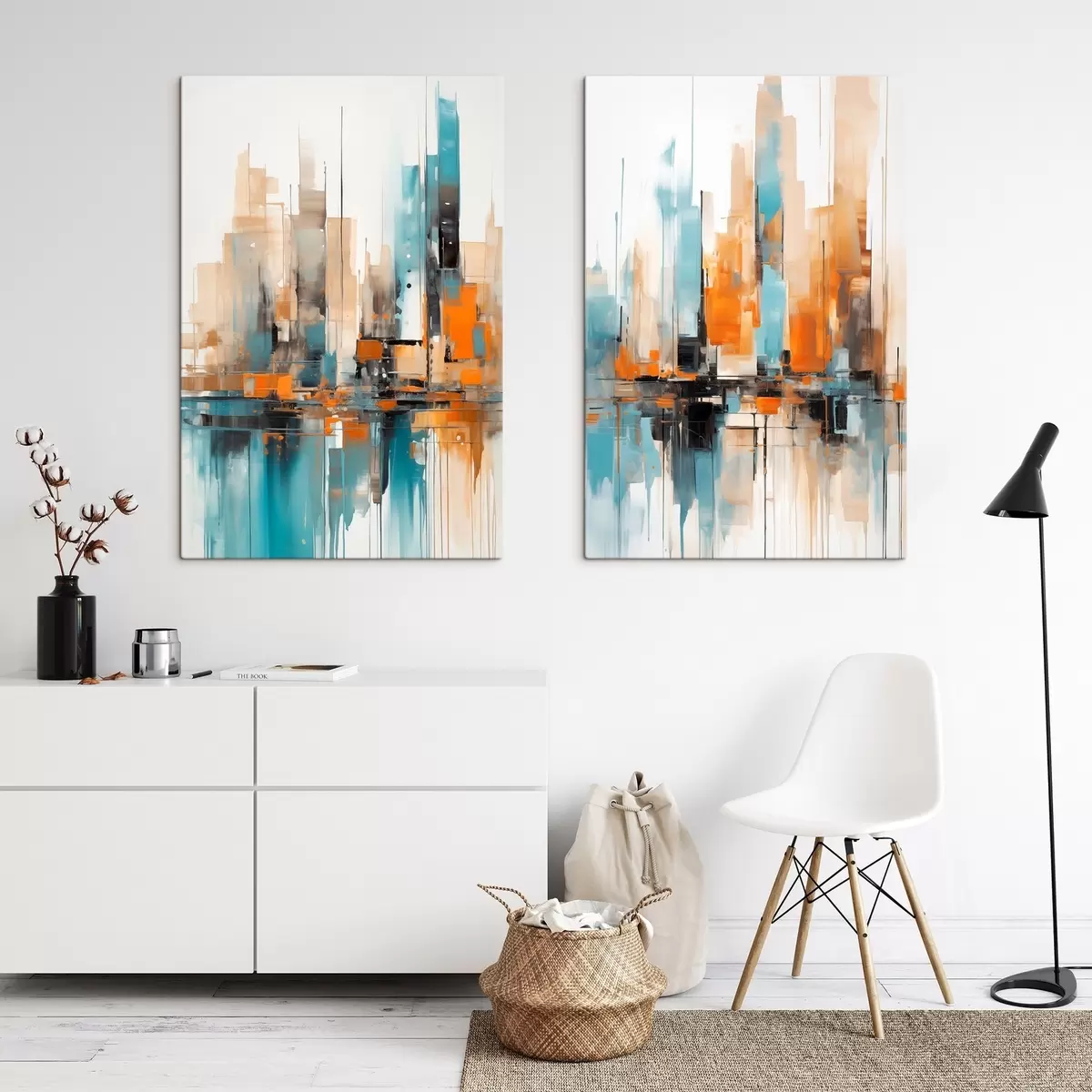 Vászonkép Absztrakt városi tájkép függőleges ecsetvonásokkal narancssárga, kék és fehér árnyalatokban, festészeti stílusban Nr m00876