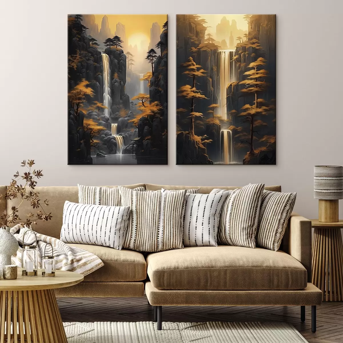 Vászonkép Táj vízeséssel és hegyekkel aranyfényben Nr m00928