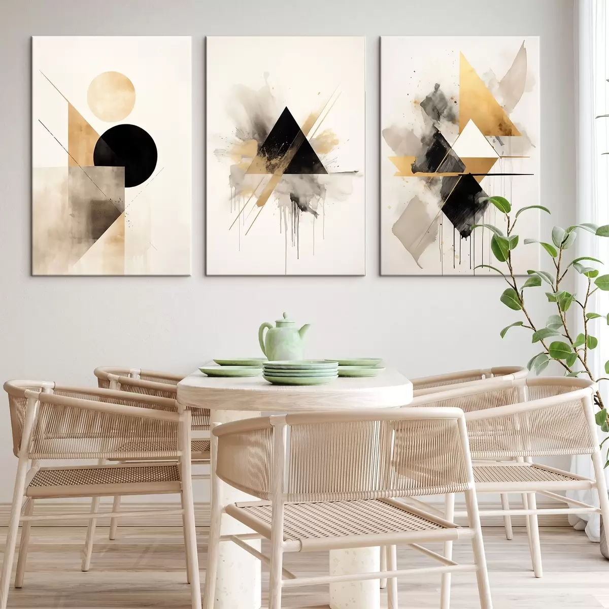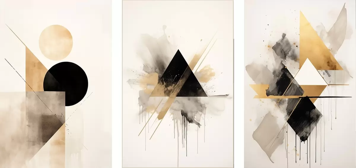 Vászonkép Geometrikus háromszögek tintacseppekkel, fekete és okker színben Nr m00963