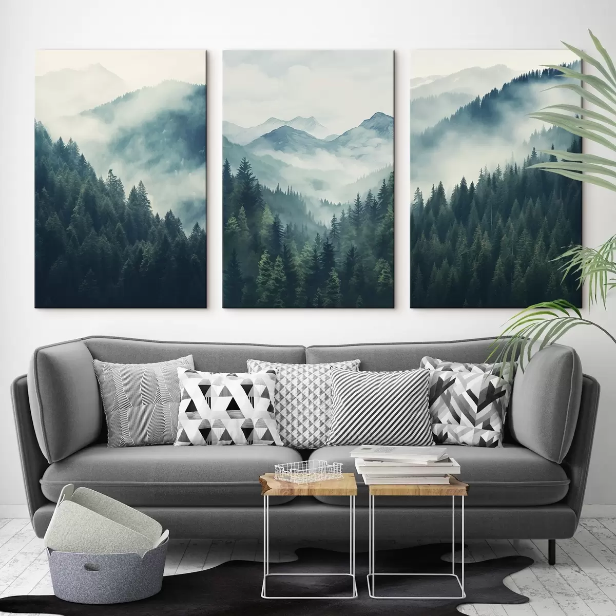Vászonkép A ködös fenyőhegyek lágy zöld és kék színekkel borítottak Nr m00964