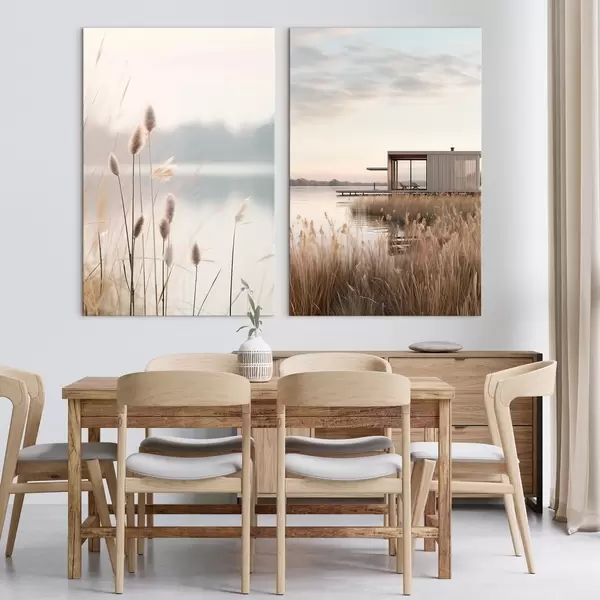 Vászonkép Lágy nádasok egy csendes tó partján és modern kunyhó a parton Nr m00970