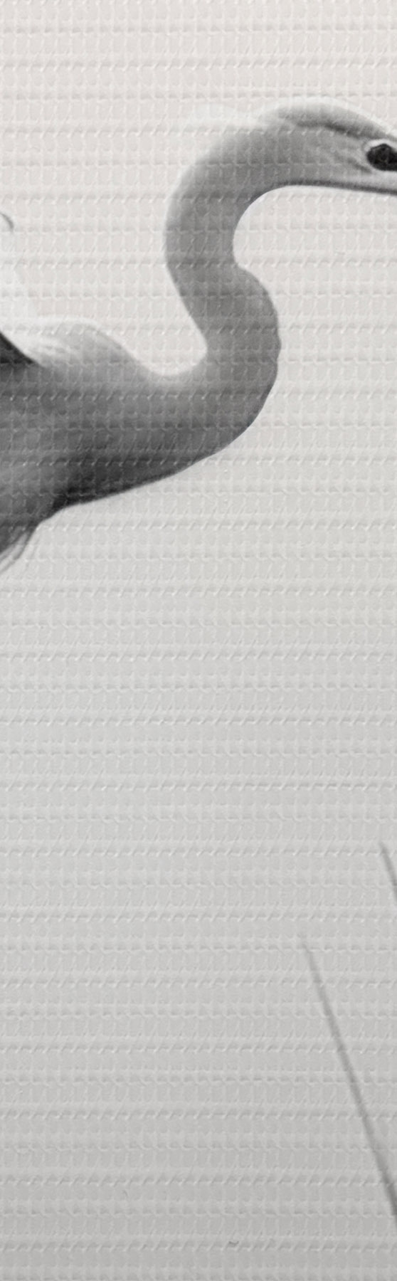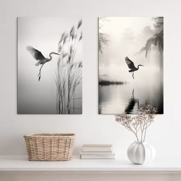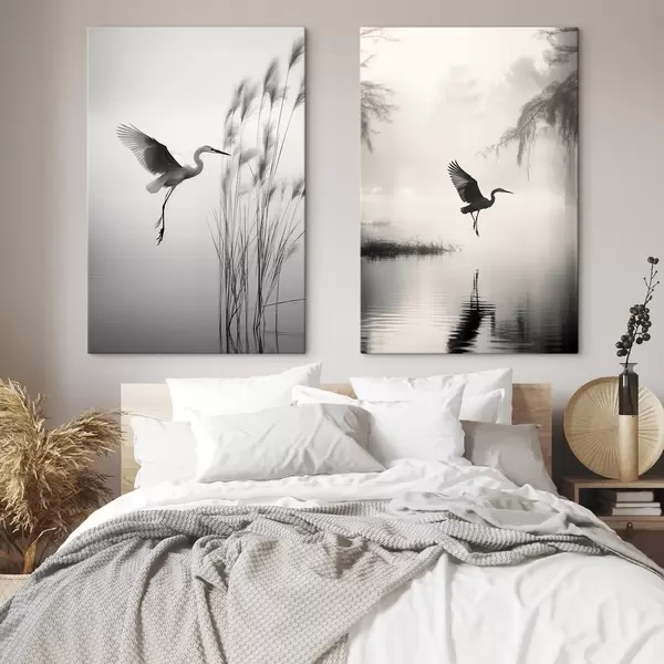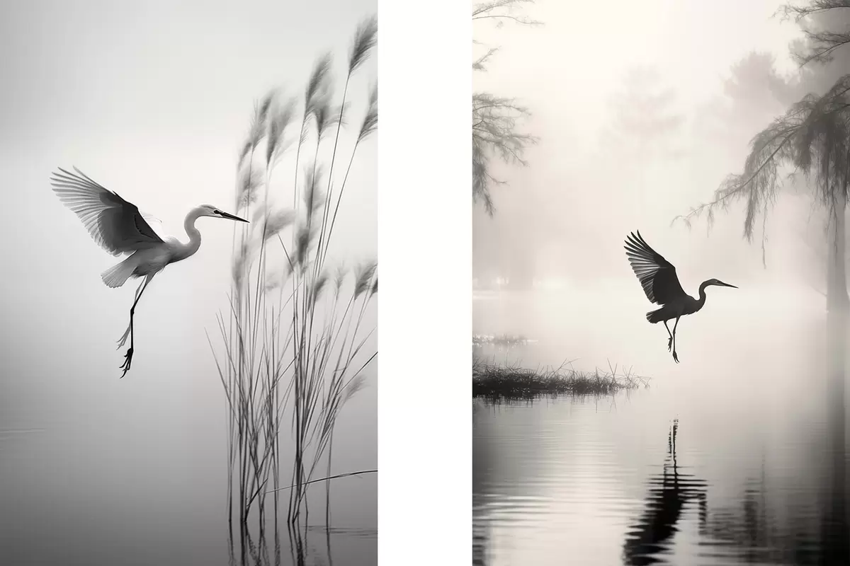 Vászonkép Fehér gém, kiterjesztett szárnyakkal, magas nádas közelében repül, fekete-fehér minimalista kompozíció Nr m01007