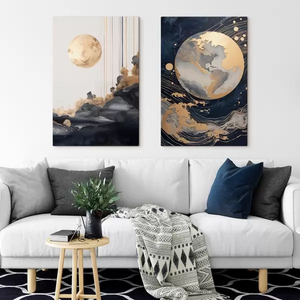 Vászonkép Texturált dekoratív bolygó az űrben sárga vonalakkal és pontokkal, absztrakt stílusban, minimalista és modern Nr m01014