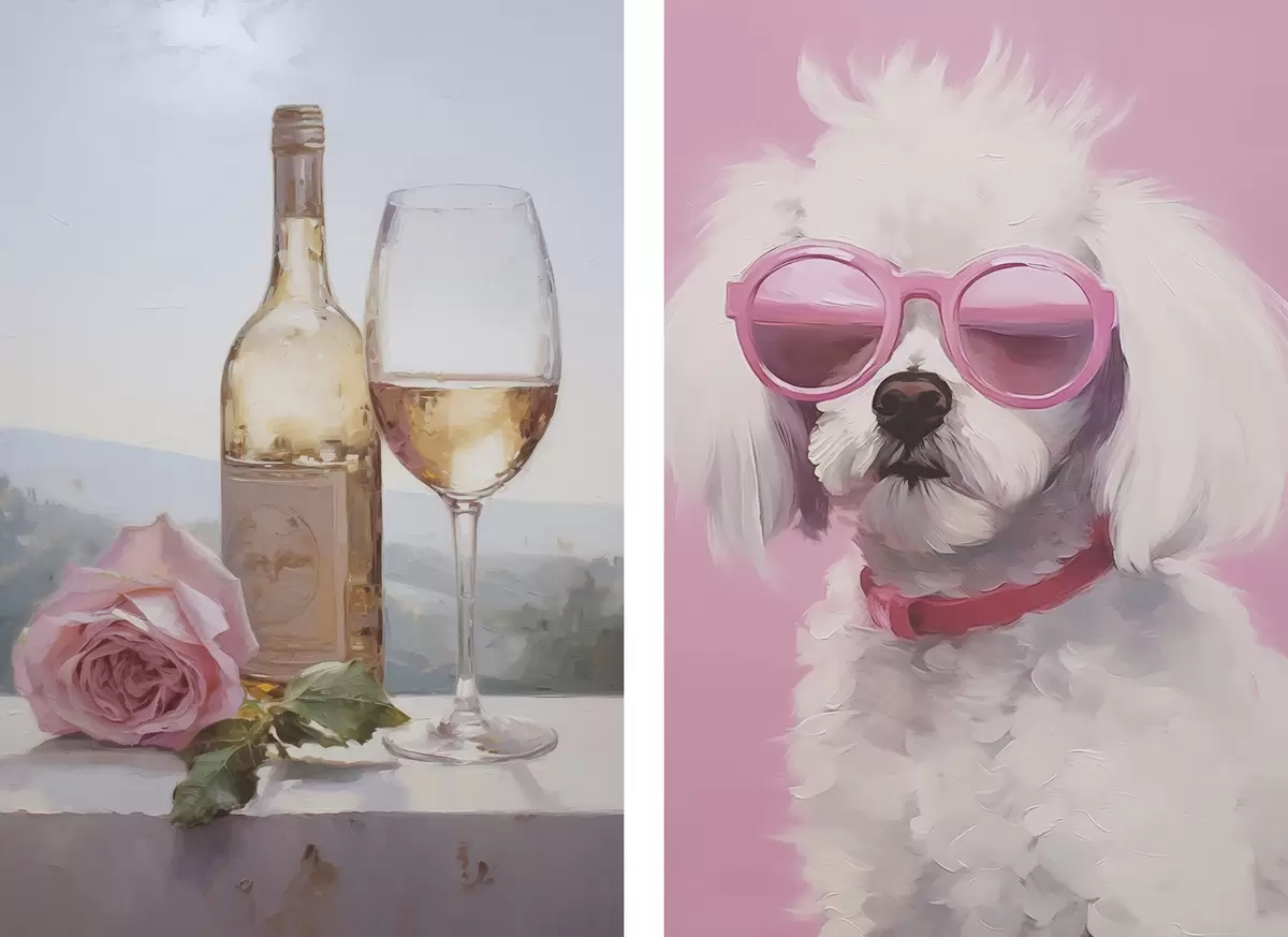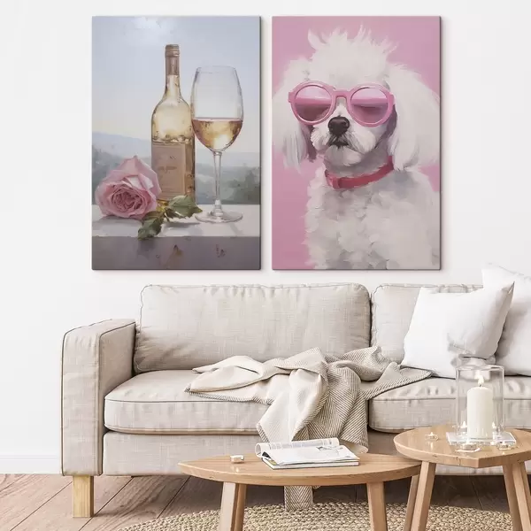 Vászonkép Egy üveg és egy pohár bor, valamint egy szemüveges pudli, utánzat festmény Nr m01021