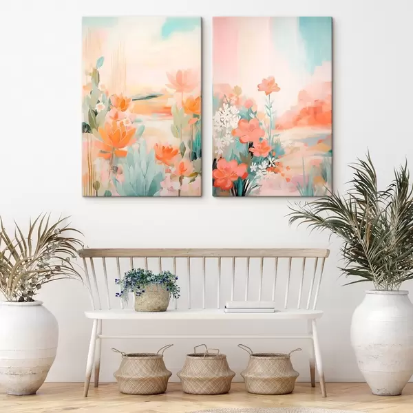 Vászonkép Pasztell tónusú virágmotívumok egy könnyű ködös völgy hátterében Nr m01085